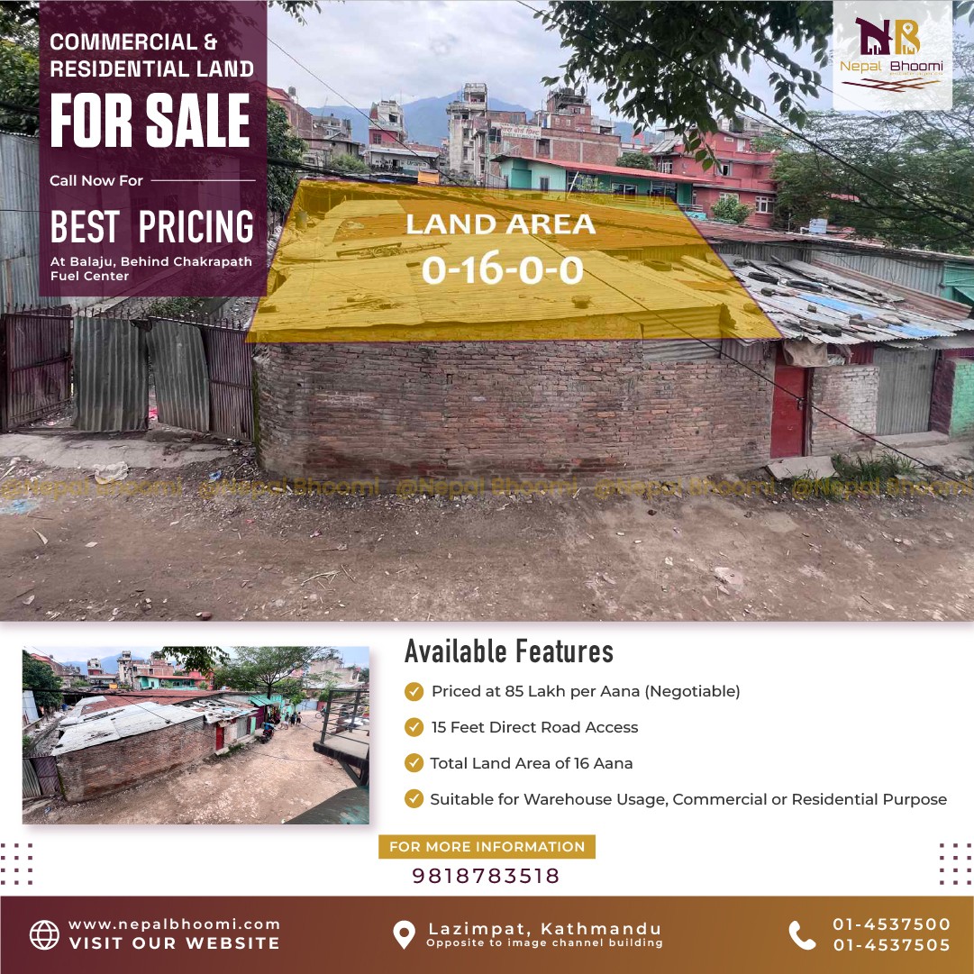 बालाजु, चक्रपथ फ्युल सेन्टर पछाडी ब्यबसायिक तथा आवासीय प्रयोजनको लागि हुने १६ आना जग्गा बिक्रीमा |-